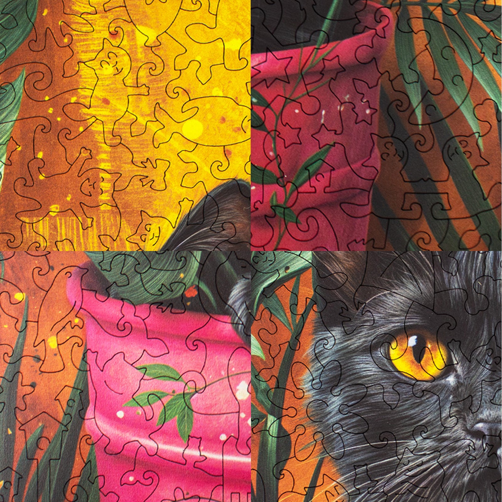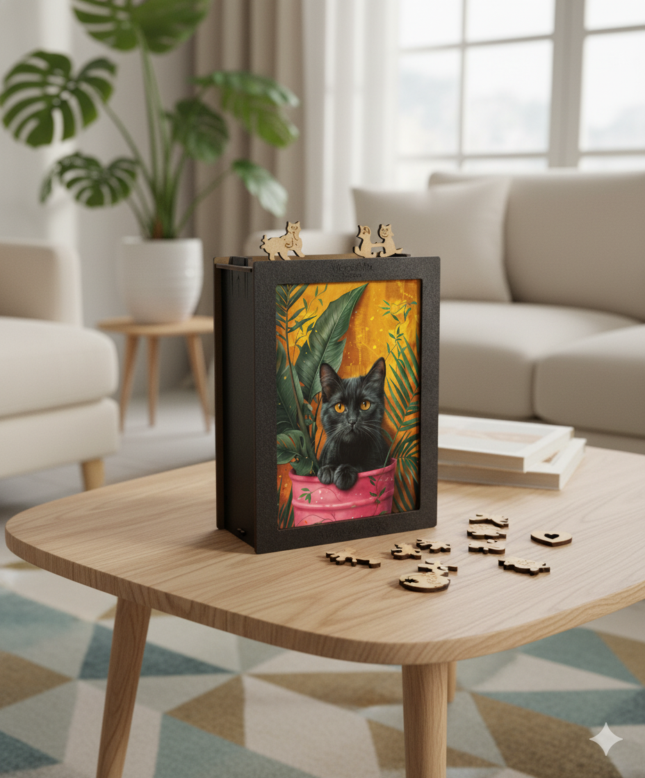 Fiecare piesă a acestui puzzle din lemn este specială, căci multe dintre ele sunt conturate în forme jucăușe de pisici, adăugând o dimensiune suplimentară de distracție și complexitate. Aceste piese cu forme unice, concepute cu măiestrie de noi, te vor scufunda și mai adânc în povestea magică a pisicilor, oferindu-ți cât mai multe descoperiri uimitoare pe parcurs. Este o experiență de asamblare cum nu ai mai întâlnit, unde fiecare pisicuță decupată devine o mică bucurie în sine!
